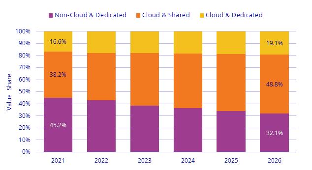 从长远来看,IDC 预测,在 2021-2026 年的预测期内,云基础设施支出的复合年增长率 (CAGR) 将达到 12%,到 2026 年将达到 1340 亿美元,占计算和存储基础设施总支出的 67.9%。共享云基础设施将占云总量的 71.9%,复合年增长率为 12.7%。专用云基础设施的支出将以 10.4% 的复合年增长率增长至 377 亿美元。非云基础设施的支出将以 0.2% 的复合年增长率增长,到 2026 年达到 634 亿美元。服务提供商在计算和存储基础设施上的支出预计将以 10.9% 的复合年增长率增长,到 2026 年达到 1302 亿美元。