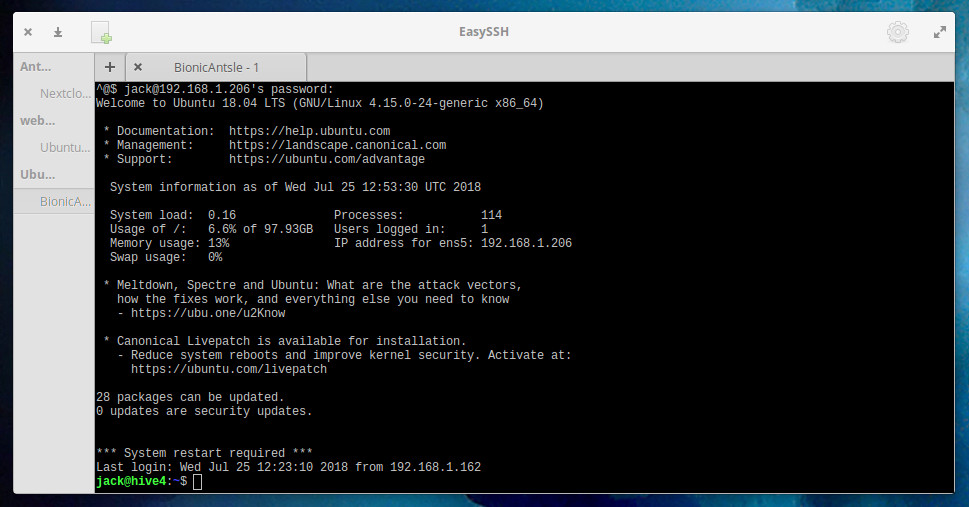 填写完配置后,单击“保存”即可完成。从左侧导航中单击要进行的连接,然后单击“连接”按钮。EasySSH将导航身份验证,您将发现自己已登录到远程计算机(如下图)。