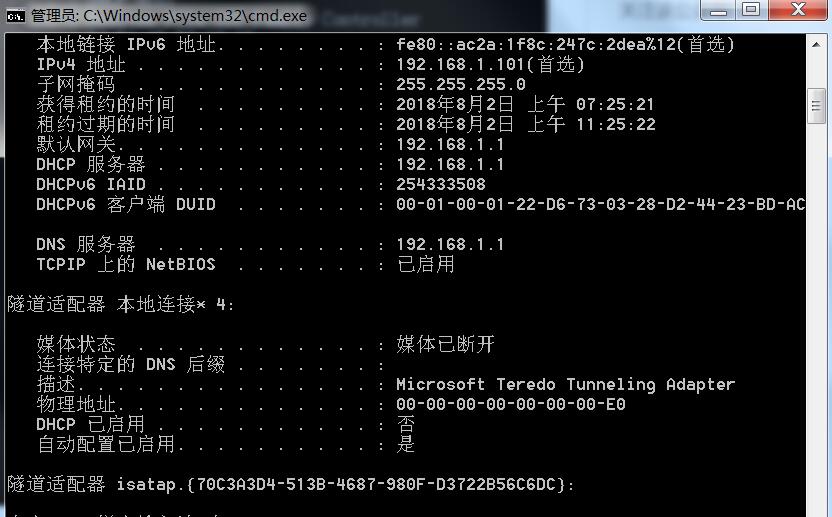 ipconfig实用程序可用于显示当前的TCP/IP配置的设置值。这些信息一般用来检验人工配置的TCP/IP设置是否正确。
