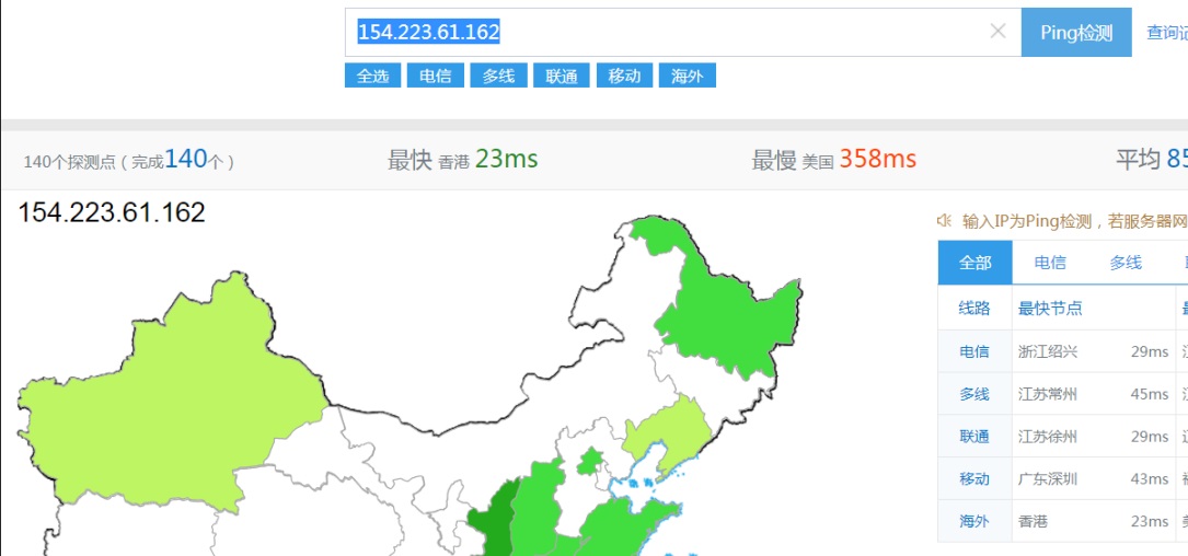 首先通过PING检测台湾机房到国内各地区的延迟(如下图所示)。延迟最小的为香港为23MS,在东部沿海地区,如浙江、江苏延迟也在30MS以内,广东深圳43MS。