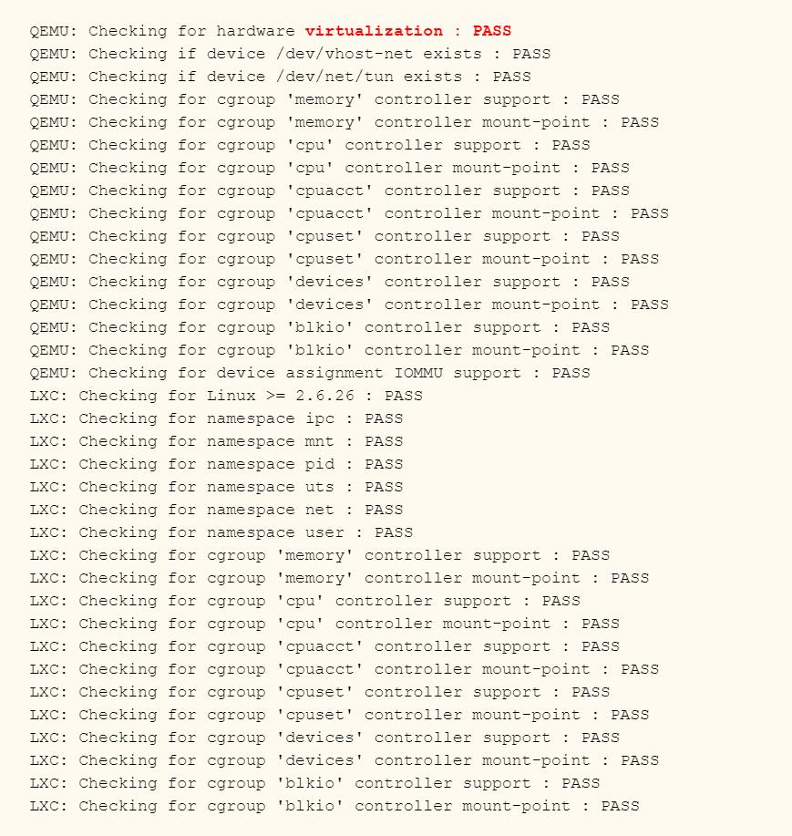 一旦安装了cpu-checker软件包,请运行以下命令以检查是否启用了VT支持: