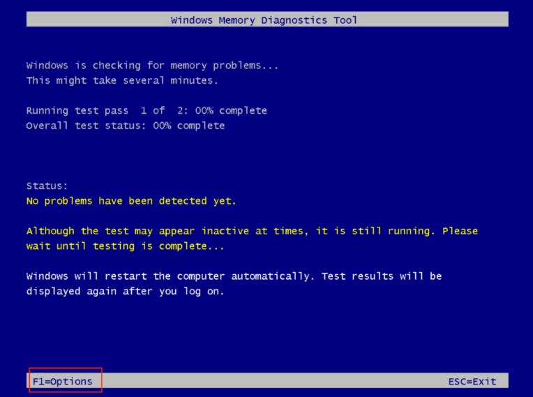 当计算机重新启动时,您将看到蓝屏,它将跟踪测试进度。您可以按F1更改测试选项或让它以标准设置运行(图C)。