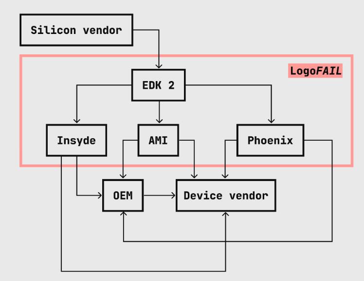 我们一直重点关注报告产品发现的漏洞,但 LogoFAIL 的工作有所不同,最初只是为了好玩而作为一个小型研究项目启动,在展示了图像解析固件组件的大量有趣的攻击面后,该项目发展成为全行业范围内的大规模披露。