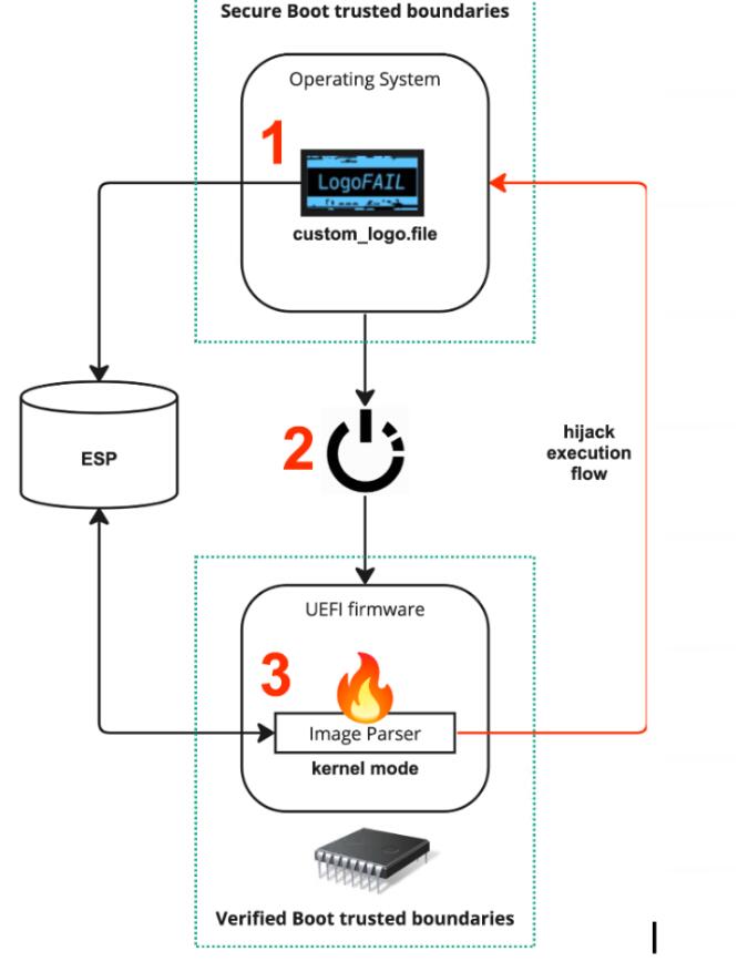LogoFAIL是一系列漏洞,系统固件中的图形图像解析器可以使用自定义版本的图像解析库。从本质上讲,攻击者可以替换设备启动时出现的图像或徽标(因此称为名称),并从那里获取对操作系统和内存的访问权限(图 A)。
