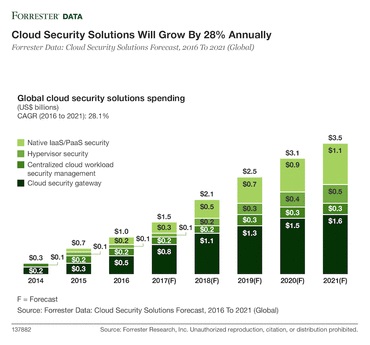 数据统计,在2021年前,云安全解决方案市场每年将以28%的幅度增长,从2016年的10亿美元增长到2021年的35亿美元。但与公有云市场相比,这一市场规模仍然较小,到2020年将达到2360亿美元。