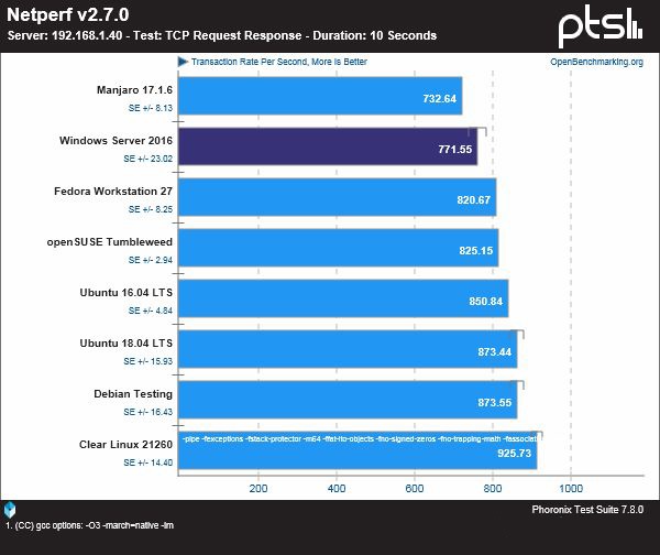 Linux 在 Netperf TCP 测试中占主导地位,但与 Windows 的数据相比,Manjaro 17.1.6 运行得比较慢,而英特尔的 Clear Linux 运行速度最快。