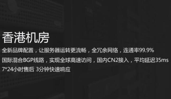 我司香港机房在中国大陆采用CN2线路作为主要传输路线,平均延迟35ms;国际方向采用bpg国际带宽,实现智能路由传输,由pccw+直连中国电信骨干网的CN2;双路市电+双套UPS+后备油机;高速全冗余网络,无单点故障,99%正常运行时间保证;