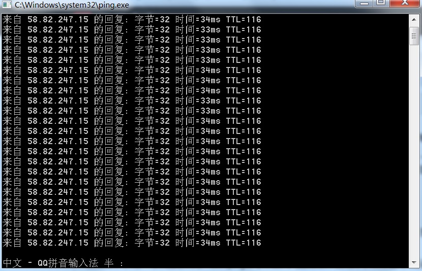如图所示,使用ping命令检查到IP地址58.82.247.15(此IP为我司香港机房的服务器IP)的计算机的连通性,从图中可以看出,延迟为33ms、34ms。延迟正常,网络连通性稳定。