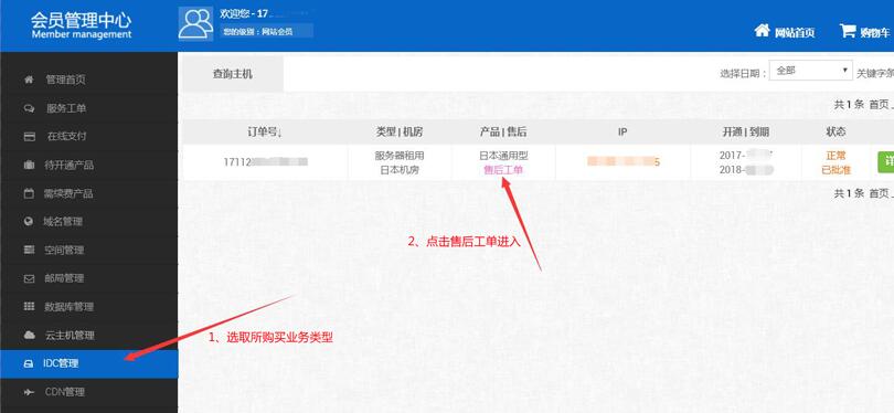 1、选取所购买产品栏目,找到需要提交工单的产品。