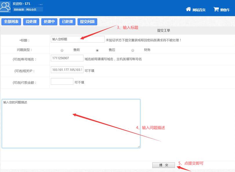 3、进入售后工单后,填写标题与问题描述,点下面的提交即可。(如下图中步骤3、4、5)